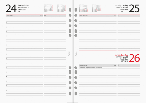 • Praktisk årssett for Aplan perm/planlegger med en dag per side, klokkeslett 08:00-23:00