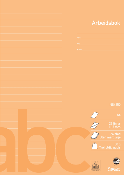 Bantex arbeidshefte A4, 23 linjer, 11,5 mm ml linjene. NS. Lys aprikos, 80 g treholdig papir, 24 blad.