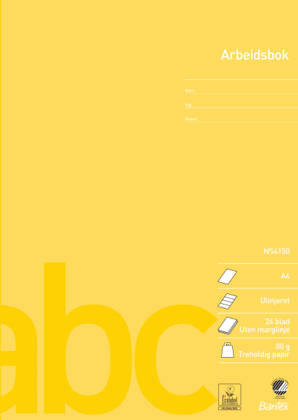 Bantex arbeidshefte A4, ulinjert. NS. Gul, 80 g treholdig papir, 24 blad.