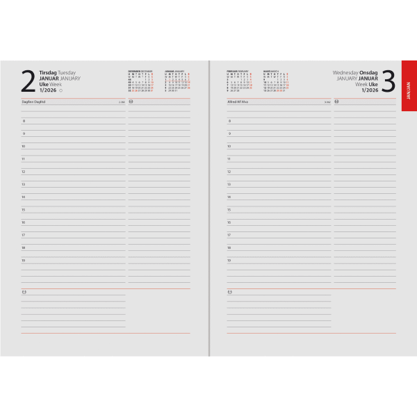 - En dag per side med klokkeslett fra 08:00-19:00
