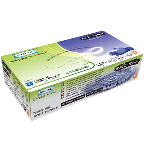 Engangshanske Soft Nitrile pudderfri og akselleratorfri med indigofarge. Myk og sterk Nitril i beste kvalitet. Tynnere enn tilsvarendehansker, men med nesten samme elastisitet og fingerfølsomhet somlatexhansker. Gir ingen latex-allergi (Type I). 100 % uten kjemiskeakselleratorer. Mikroteksturert for optimalt grep. Tåler fett,rensemiddel etc. Egnet til direkte kontakt med alle typernæringsmidler.Godkjent for medisinsk bruk (EN 455). AQL 1.5