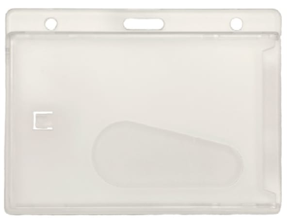 Kortholderen er laget i hard plast (polykarbonat) og har et liggende (horisontalt) format som gjør det enkelt å vise frem kortets innhold. Den passer standard CR80-kort (85,6 x 54 mm), og er godt egnet for bruk i kontor, skole, helsevesen, industri og arrangementer.