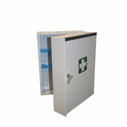 Skap for medisiner og/eller førstehjelpsutstyr. Mål:46x35x18cm. Uten innhold. Hvitt, laget i metall men hyller i plast. Lås med to nøkler. Skruehull.