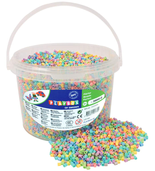Stor pakke med Svanemerkede perler for perleplater, i fine pastellfarger. Perler er en tradisjonell leke, som er perfekt for å la barna være kreative og lage sine egne motiv. Brukes sammen med midi perleplater. Laget av LDPE i fargene, rosa, lilla, blå, turkis, grønn, gul og grå. Høyde 5mm, Ø5mm, hull Ø2,5mm.