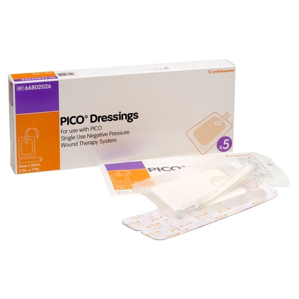 Pico bandasjen er spesielt utviklet for klinisk effektiv behandling av kirurgiske, kroniske og akutte sår. De gir en pålitelig løsning for å fremme sårtilheling og optimalisere behandlingsresultatene. PICO bandasjene er utstyr med "AIRLOCK Technology" som sikrer distribusjon av jevnt og konstant trykk over sårområdet. Dette bidrar til å skape et optimalt miljø for sårtilheling og effektiv væskehåndtering.Bandasjene er designet for å gi kontinuerlig behandling i opptil syv dager. Dette reduserer behovet for hyppige bandasjeendringer og gir en mer praktisk og kostnadseffektiv behandlingsløsning. PICO sårbehandlinggsystem er støttet av omfattende og solid klinisk forskning. Det setter nye standarder for effektivitet og bidrar til å redusere forsinkelser i sårtilheling og komplikasjoner i operasjonssåret.