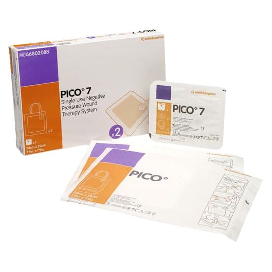 Engangsenhet til sårbehandling med negativt trykk. PICO 7 er en unik metode for å behandle pasienter som kan ha nytte av sårbehandling med negativt trykk (NPWT - negative pressure wound therapy). PICO 7 består av en liten, bærbar pumpe med en levetid på opp til 7 dager. PICO-pumpen genererer et effektivt negativt trykk på 80 mmHg, men er likevel liten nok til å passe i lommen. PICO-pumpen kobles til en spesialdesignet bandasje, som opprettholder det negative trykket over hele sårsengen, og fjerner eksudatet fra sårsengen gjennom absorbering og fordamping. I hver eske er det én pumpe pluss to AA litiumbatterier samt to bandasjer pakket hver for seg, klare til bruk og med festeremser. På slutten av perioden kan pumpen og batteriene håndteres og resirkuleres som ikke-klinisk avfall. Siden PICO er til engangsbruk, kan den ligge lett tilgjengelig på hyllen når behov for behandling oppstår.