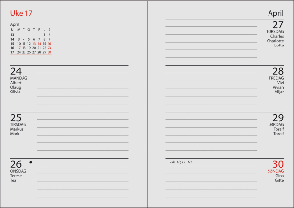 7. sans Primo brukes av mange pga det hendige formatet. En uke pr oppslag. Månedsoversikt inneværende og neste år. Notatsider og infosider. 16 sider atlas. Norske navnedager og helligdager.