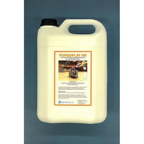 Inngår som ett av 3 midler i Purgoplay renholds -og vedlikeholds-program for innendørs sportsgulv. Brukes som regel på store flater i kombimaskiner, men kan også brukes manuelt. Har en nøytraliserende effekt og har rollen som komplimenterende produkt til Purgoplay VV, for å opprettholde riktig og jevn friksjon på innendørs sportsgulv i Purgoplay-programmet som også består av Purgoplay S1 Ekstra . Purgoplay NN er også godt egnet til polishbehandlede gulv. Produktet skader heller ikke malte eller lakkerte flater.