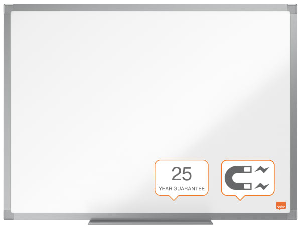 Emaljert, magnetisk whiteboard med aluminiumsramme. Henges opp på veggen med hjørnemontering. Slank aluminiumsramme. Romslig pennehylle. Den emaljerte overflaten har meget god avtørkingsevne og egnet for hyppig bruk. 25 års garanti på overflaten. Størrelse: 60x45cm.