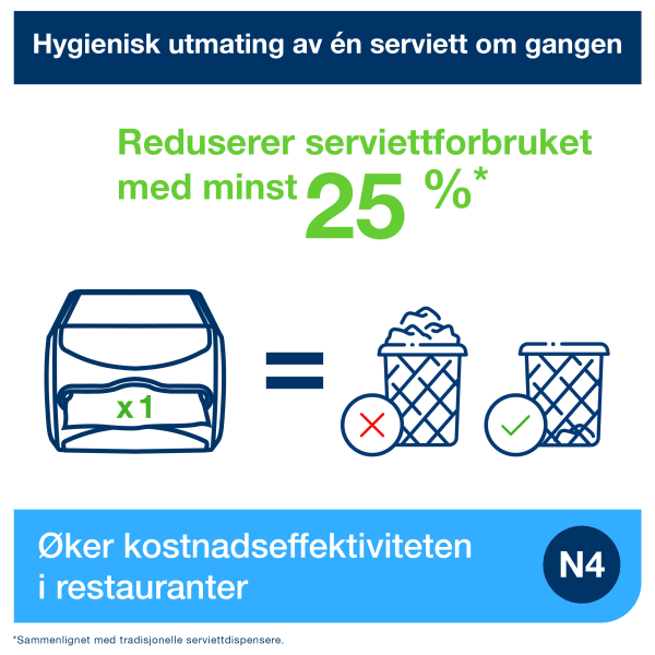 - Forbedre hygienen og reduser forbruket med utmating av én serviett om gangen