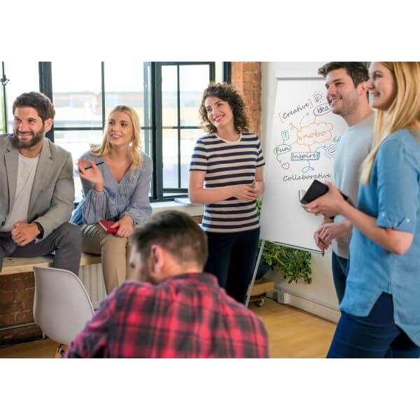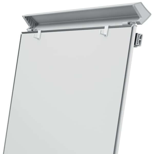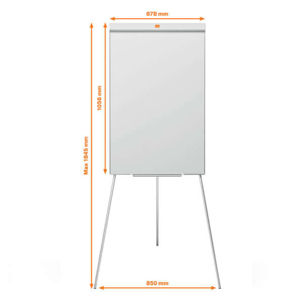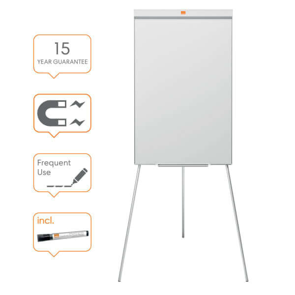 Magnetisk flippoverstativ med en moderne, slank og diskret ramme som maksimerer plassen på tavlen Romslig pennehylle som er montert under tavlen. Bena er justerbare for høyde og slås sammen for lagring eller flytting. God avtørkingsevne.