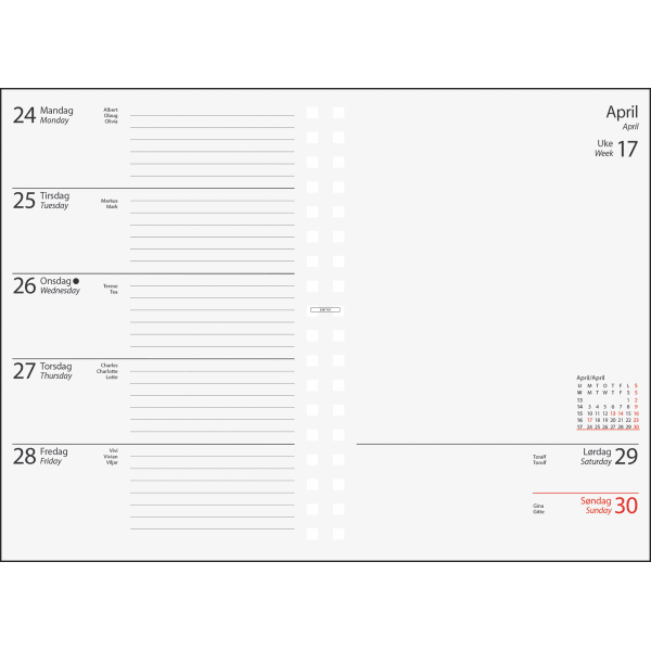 - Klassisk kalendarie hvor du har oversikt over hele uken på høyre side