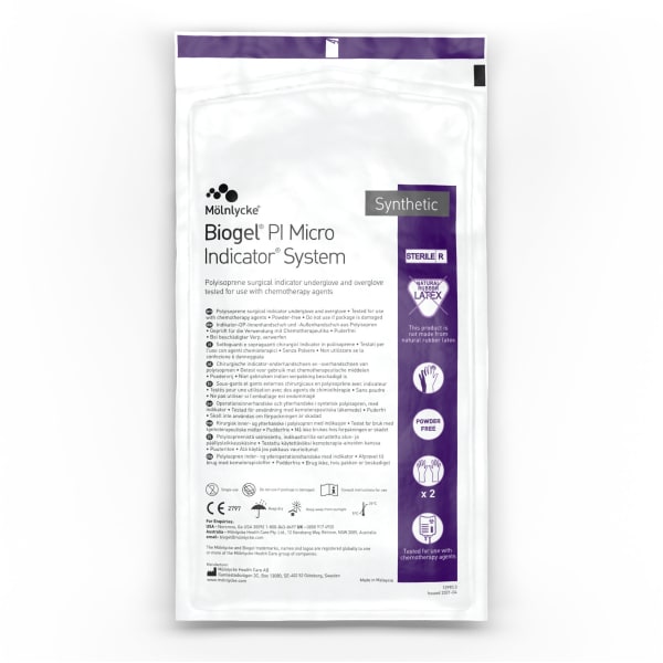 Biogel® PI Micro Indicator® System er et dobbeltpakket hanskesystem (pudderfri og latexfri) bestående av en blå innerhanske og en stråfarget ytterhanske som sammen danner et effektivt fargeindikeringssystem. Systemet er dokumentert å gi en tydelig, rask og stor fargeindikasjon ved perforasjon. Hansken er 20 % tynnere enn Biogel® PI Indicator®, og er utviklet for å gi forbedret fingerfølsomhet – selv ved bruk av doble hansker. I tillegg er den testet og godkjent for bruk med kjemoterapeutiske midler**. Biogel hansker er designet for optimal komfort og høy taktil følsomhet. Produksjonen følger strenge kvalitetsstandarder, inkludert flere vaskesykluser og lufttesting av hver enkelt hanske for å sikre pålitelighet og sikkerhet. ** Se eget datablad for gjennombrudstid og brukerveiledning for kjemikalier og kjemoterapeutiske midler.