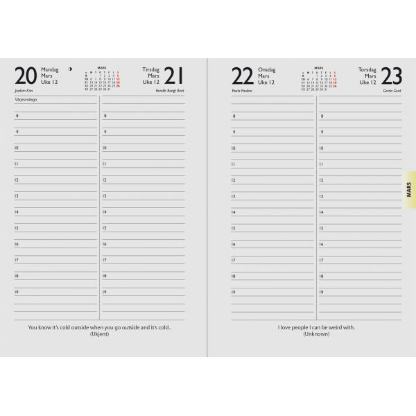 - To dager per side med klokkeslett fra 08:00-19:00
