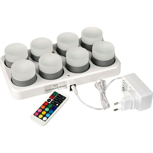 - Du får med 8 lys, ladestasjon og fjernkontroll