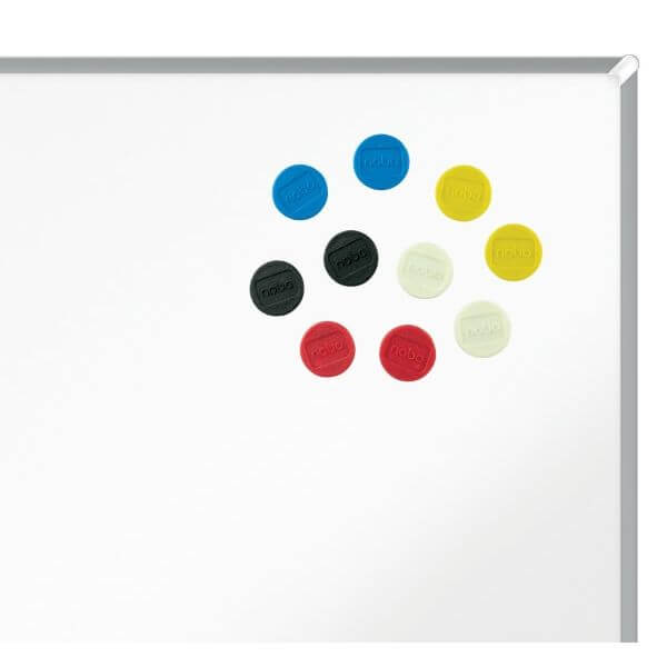 Nobo Whiteboard magneter 13 mm, pakke med 10 stk assortert fargede magneter. Disse runde magnetene er det perfekte verktøyet for å vise og visualisere ideer for samarbeidende idédugnad på magnetiske tavler eller andre magnetiske overflater. De kan for eksempel brukes som kjøleskapsmagneter for å henge opp påminnelser og viktige meldinger hjemme. Disse magnetene holder ett 80g A4-ark, en magnet har en magnetstyrke på 100g. Pakken inneholder 2 røde, 2 grønne, 2 blå, 2 svarte og 2 gule magneter.