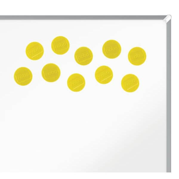 Nobo Whiteboard magneter 38 mm, styrke 2,5 kg, pakke med 10 stk. gule runde magneter. Disse sterke magnetene er det perfekte verktøyet for å vise og visualisere ideer for samarbeidende idédugnad på magnetiske tavler eller andre magnetiske overflater. De kan for eksempel brukes som kjøleskapsmagneter for å henge opp påminnelser og viktige meldinger hjemme. En av disse magnetene kan holde opptil 20 stk. 80g A4-ark, de er 38 mm i diameter. De har en magnetstyrke på 2,5 kg.