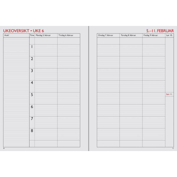 - Ukeoversikter og rikelig med plass til notater og oppgaver