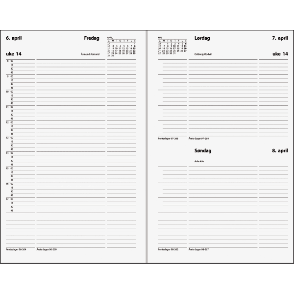 - En dag per side med klokkeslett fra 08:00-18:00, inndelt per kvarter