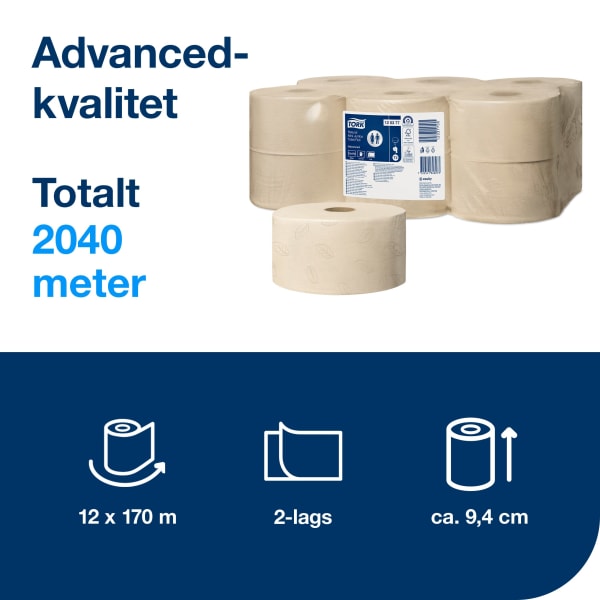 Spar både tid og penger med 2-lags Tork Mini Jumbo Toalettrull. Den er ideell for toalettrom med middels til stor pågang. Den inneholder flere tørk enn standardruller, som betyr mindre tid brukt på påfylling for deg og dine ansatte. Gjestene får også et positivt inntrykk ettersom det perforerte papiret gjør det enkelt for brukerne å ta akkurat det de trenger. Den naturlige fargen kommer fra bruk av resirkulerte pappesker som én av fiberkildene i papiret. Det er ikke tilført noe farge i produksjonsprosessen. I tillegg kan du redusere risikoen for å gå tom for papir ved å bruke Tork-dispensere med høy kapasitet.