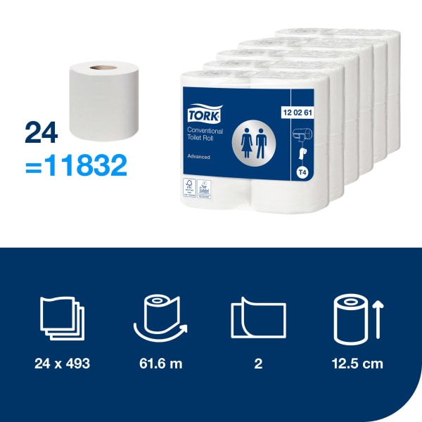 Gi gjestene dine komforten de er vant med hjemme med Tork Konvensjonell Toalettrull Advanced. Dette toalettpapiret balanserer kostnad og ytelse for toalettrom med lav pågang.
