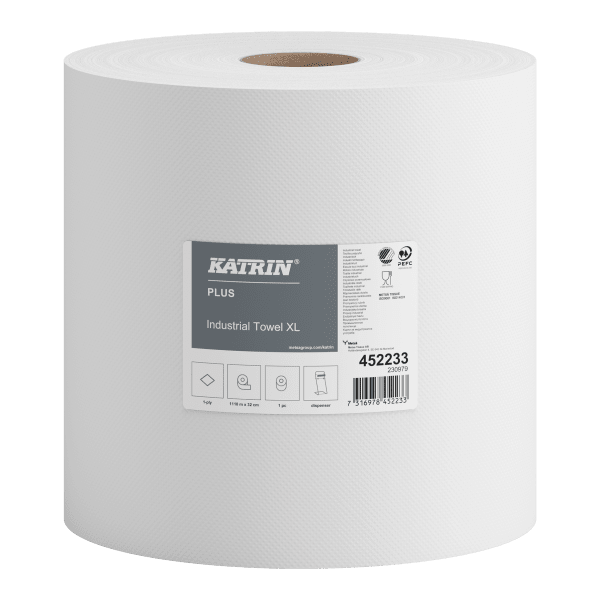Katrin Plus XL 1-lags hvitt, sterkt industritørkepapir på rull. Rask og høy absorpsjonsevne. Egnet til bruk ved krevende oppgaver i ulike bransjer. 1110m på rull. Bredde: 32 cm. Godkjent for kontakt med næringsmidler. Tilhører Black Line stativ systemet