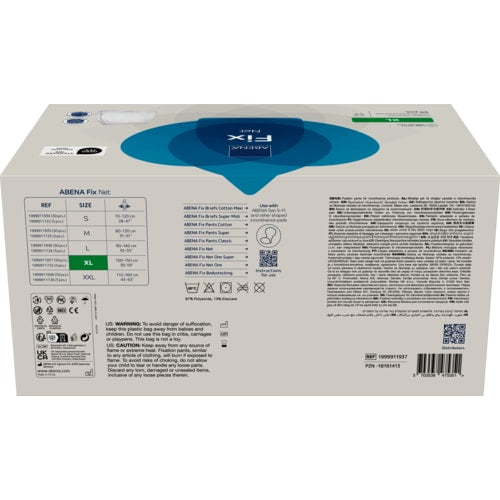 Abri-Fix Net er en tynn unisex nettfikseringstruse til flergangsbruk. Nettstrikketeknologien er basert på en metode hvor garnet strikkes i zig-zag-masker i materialets lengderetning. Abri-Fix Net har horisontale stabiliserende soner som er ideelle til å holde bind/bleier sikkert på plass. Til tross for sin lette konstruksjon er nettproduktet holdbart i bruks- og pleiesituasjoner. Abri-Fix Net har fargekodet linning som viser størrelsen og gir enkel produktidentifikasjon. 87% polyester, 13% elastan.