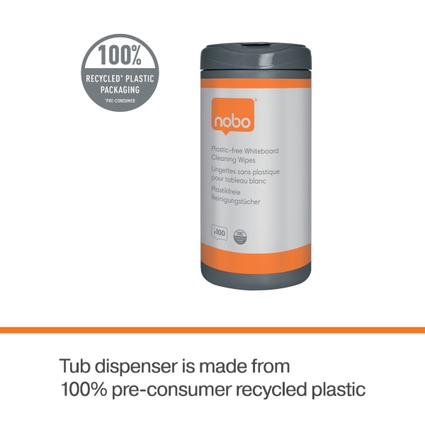 Disse rengjøringsserviettene for whiteboardtavler er ideelle for å holde tavlen i perfekt stand. Perfekt for kontorer, skoler og hjemmekontorer. Pakken inneholder 100 forhåndsfuktede, plastfrie våtservietter for daglig vedlikehold. Våtserviettene er tøffe mot smuss og skitt på alle whiteboard-overflater, og kommer i en dispenser laget av 100 % resirkulert husholdningsplast. Det letthengslede lokket sørger for rask tilgang og forhindrer uttørking, perforert kant på serviettene lar deg enkelt trekke av en og en serviett. For optimale resultater, bruk sammen med en Nobo pussekloss for å holde whiteboardtavlen i best mulig stnad. 100 servietter i en dispenser.