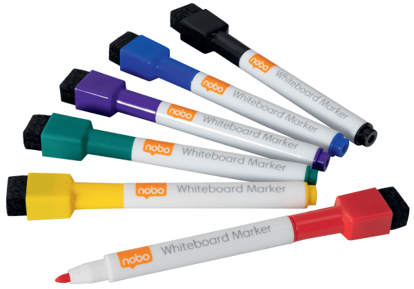 Mini whiteboardpenner med integrert magnetisk pussekloss i den magnetiske hetten gir god synlighet på ikke-porøse overflater. Pakke med 6 assorterte whiteboardpenner i fargene sort, mørk blå, grønn, gul, rød og lilla. Pennene har en 2 mm spiss for jevne, glatte linjer. Bruk på en Nobo whiteboard for optimal ytelse.